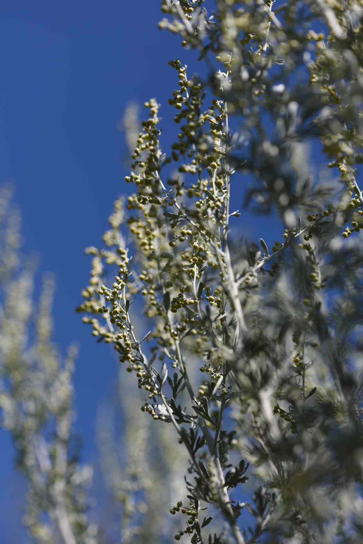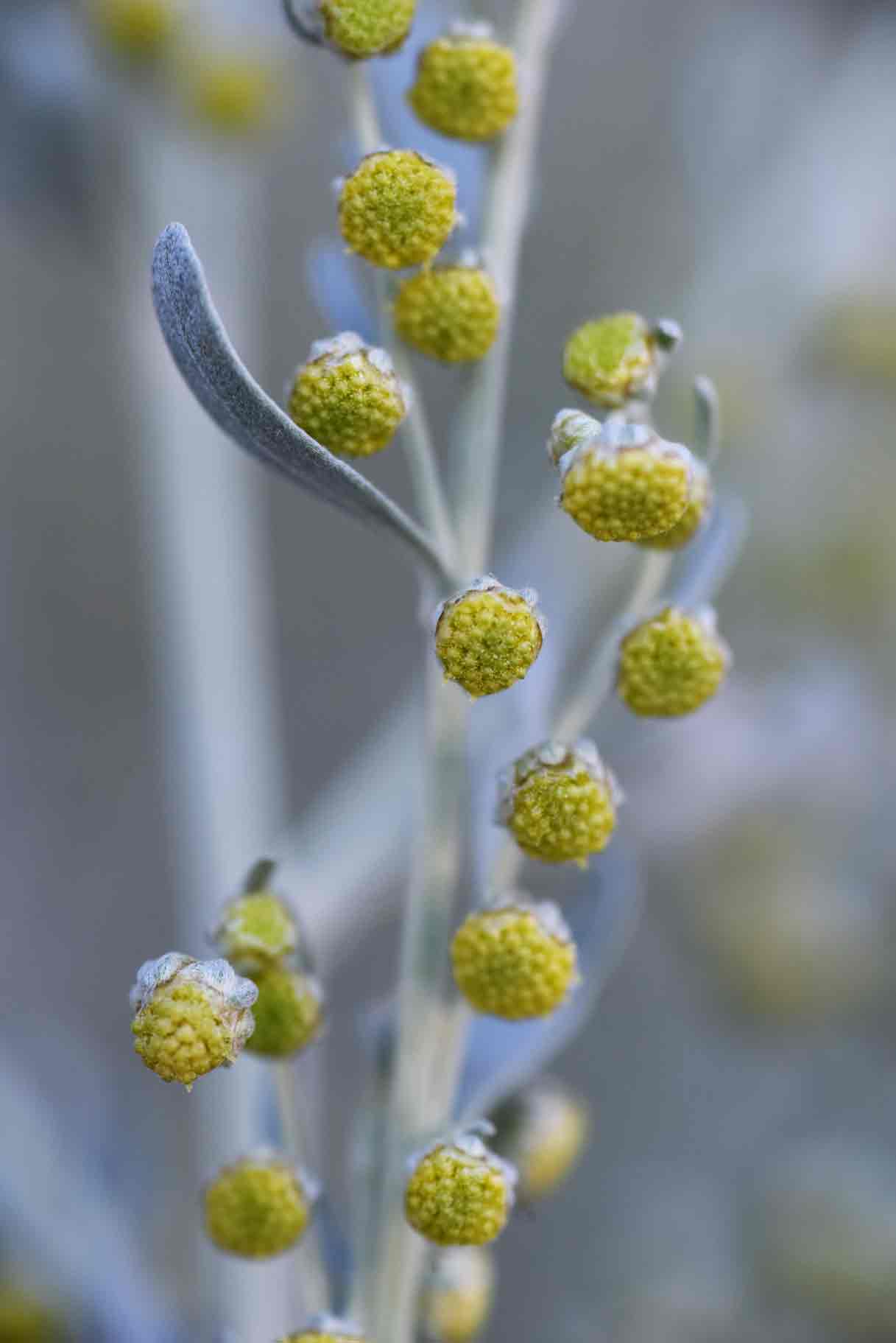 L’absinthe, Artemisia absinthium L., appartient à la famille des astéracées (Asteraceae). C’est une plante vivace pouvant atteindre 2 m de haut, que l’on trouve de préférence dans les endroits chauds et secs. Ses tiges et ses feuilles sont recouvertes de poils grisâtres et feutrés. Plus on remonte le long de ses tiges droites et ligneuses, plus les feuilles sont divisées jusqu’à ce qu’il ne reste que des folioles étroites et lancéolées dans l’inflorescence. L’absinthe fleurit au milieu de l’été, de juillet à septembre, avec de petites fleurs jaunes peu visibles, tournées vers le sol. Contrairement à d’autres espèces de composées, l’absinthe est pollinisée par le vent, alors que la plupart des autres composées attirent les animaux avec leurs grandes et magnifiques fleurs. Dans l’ensemble, la plante entière, malgré sa taille, semble presque insignifiante jusqu’à ce que l’on goûte à son arôme….