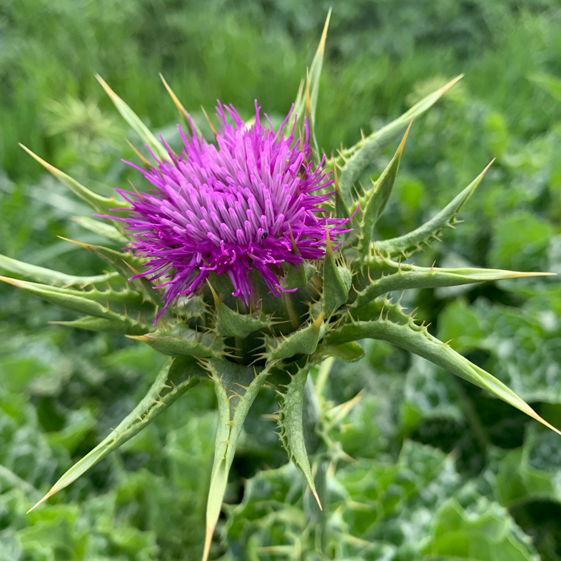 “Le chardon-Marie préfère les endroits chauds et secs ; il est originaire du bassin méditerranéen, où il est très répandu. En Europe centrale, il est parfois cultivé. Le chardon-Marie est une plante à forte personnalité. Avec sa taille imposante et ses épines extrêmement résistantes, il impose le respect et tient les hommes et les animaux à bonne distance. Avec ses feuilles caractéristiques bicolores et coriaces, il porte le sceau d’une individualité marquée : il ne peut pas être ignoré ou confondu. Une fois que l’on a vu un chardon-Marie, on ne l’oublie plus. La signature du chardon-Marie exprime clairement l’essence de la protection, de la délimitation et de l’individualité. Comme beaucoup d’autres espèces de chardons, il est armé de pointes d’épines sur les corbeilles de fleurs et les feuilles. La fonction de défense est plus complète que chez presque tous les autres chardons. Un simple contact suffit pour que les épines pénètrent dans la peau. Ils sont si tranchants, durs et longs que l’on ne peut s’approcher de la plante qu’avec une extrême prudence. Lors de la récolte des capitules mûrs, cette résistance est souvent douloureusement ressentie malgré les vêtements de protection. Les feuilles sont très fermes, brillantes et ressemblent durablement aux feuilles ou aux aiguilles des plantes résistantes à l’hiver. La coloration caractéristique des feuilles est le signe distinctif le plus sûr du chardon-Marie. Le vert riche est recouvert d’un réseau de larges bandes blanches le long des nervures de la feuille. Ainsi, le vert des feuilles proprement dit est réparti comme des îlots dans ce réseau de bandes blanches. On distingue donc dans les feuilles des zones clairement séparées par des couleurs. Le bord de la feuille est incurvé vers l’intérieur et s’étend bien au-delà du plan de la feuille, de sorte que le périmètre de la feuille, la limite de la feuille, est nettement agrandi et souligné. Une forme plus douce de défense et de protection se trouve à l’intérieur des capitules. Les fleurs tubulaires pourpres, légèrement collantes, subissent un changement surprenant après la floraison. La couleur passe du pourpre au bleu puis au gris. Dans le même temps, les petits pétales tubulaires se replient radialement vers l’extérieur, à partir du centre du capitule, et se collent les uns aux autres. De cette manière, ils forment un toit étanche à la pluie pour protéger les fruits en cours de maturation, qui ressemble à un toit de paille conique parfait”.