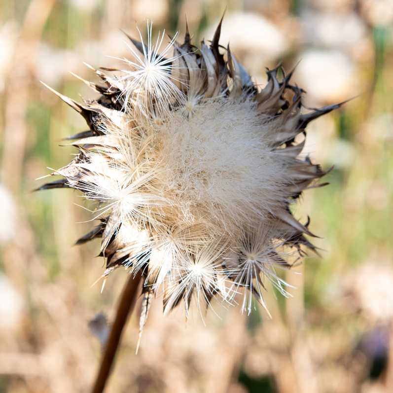 Le chardon-Marie, de son nom botanique Silybum marianum (L.) GAERTN., appartient à la famille des astéracées (Asteraceae). Il s’agit d’une plante annuelle, rarement bisannuelle, qui peut développer une forme imposante pouvant atteindre 2,50 m de hauteur. Après la germination, elle forme d’abord une racine pivotante et une rosette qui repose sur le sol. Cette rosette donne ensuite naissance à une tige droite et robuste qui se ramifie à partir du milieu environ. Sur la tige se trouvent les feuilles elliptiques allongées, pennées en forme de livre. Toutes les feuilles de la plante présentent plusieurs particularités : Tout d’abord, elles ne sont pas d’un vert pur, comme on le voit habituellement sur les feuilles des plantes, mais présentent des zones dépourvues de chlorophylle, qui sont donc “colorées” en blanc. De plus, les feuilles ne sont pas plates, comme c’est le cas habituellement, mais elles sont bombées en trois dimensions et présentent donc un bord ondulé. Le bord de la feuille, en particulier, est hérissé d’épines jaunâtres, très longues et pointues. On n’oublie pas de sitôt une rencontre imprudente avec le chardon-Marie ! Au sommet des tiges se trouvent des capitules ovoïdes de 4 à 6 cm de diamètre, de couleur pourpre, composés uniquement de fleurs tubulaires. Les inflorescences, qui fleurissent de juillet à août, sont elles aussi hérissées d’épines acérées. Après la floraison, lorsque les graines de la plante commencent à mûrir, les fleurs tubulaires se replient, se collent et forment un toit sur les graines afin de les protéger de l’humidité.