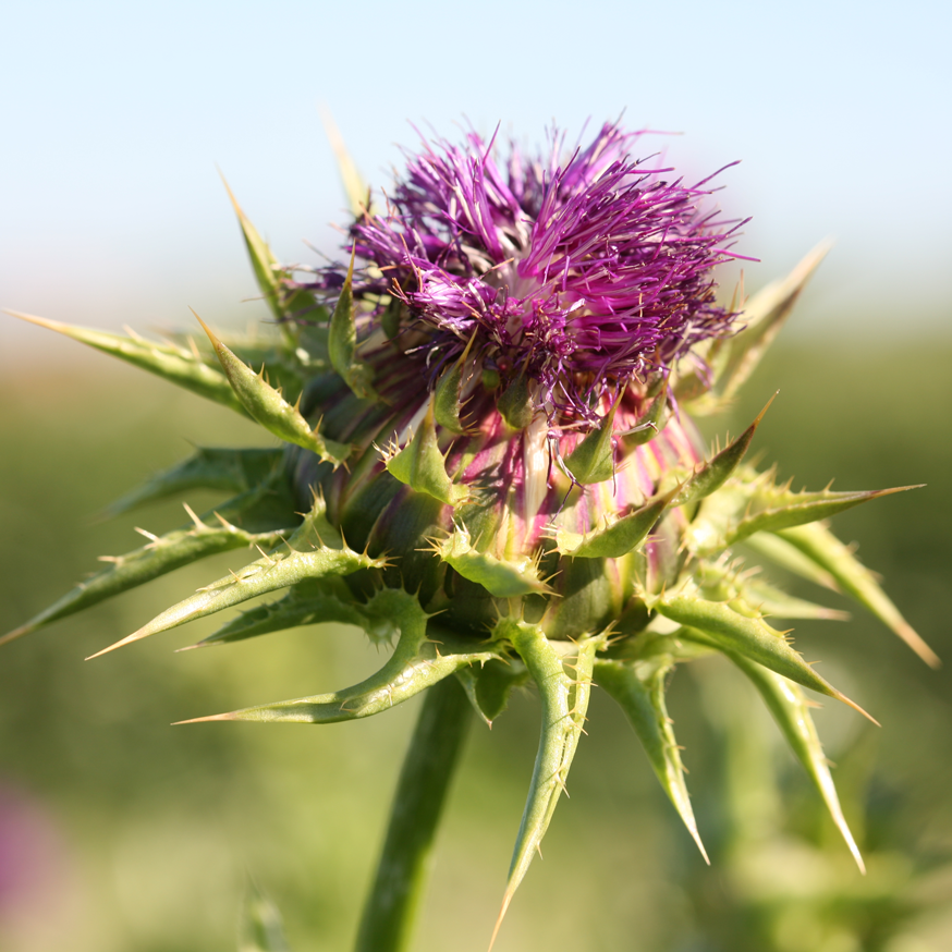 Le chardon-Marie est connu pour être l’un des principaux remèdes contre les maladies du foie et des voies biliaires. Parmi les indications typiques, on trouve les troubles dyspeptiques et les lésions hépatiques toxiques. Les maux de tête d’origine hépatique, les nausées, les troubles digestifs et les varices font partie des indications éprouvées d’un point de vue naturopathique. Le chardon-marie est également utilisé en homéopathie pour traiter les maladies hépato-biliaires. En outre, selon la pharmacopée homéopathique, le chardon-marie est utilisé en cas d’hémorroïdes et de troubles variqueux, ainsi que de rhumatismes de l’épaule et de la hanche. Les préparations phytothérapeutiques à base de fruits de chardon-marie sont utilisées comme soutien dans les maladies inflammatoires chroniques du foie et la cirrhose du foie. Silybum marianum (L.) GAERTN. fait partie des plantes médicinales particulièrement bien étudiées. Son effet protecteur sur les cellules hépatiques s’explique par les trois propriétés suivantes : stabilisation de la membrane des cellules hépatiques, fonction de piégeage des radicaux libres et fonction antioxydante et accélération de la régénération des cellules hépatiques. Ainsi, le chardon-Marie a le potentiel de contrecarrer l’exposition à des substances nocives pour le foie. Cette propriété est mise à profit dans l’utilisation de la silibinine en cas d’intoxication à l’amanite.