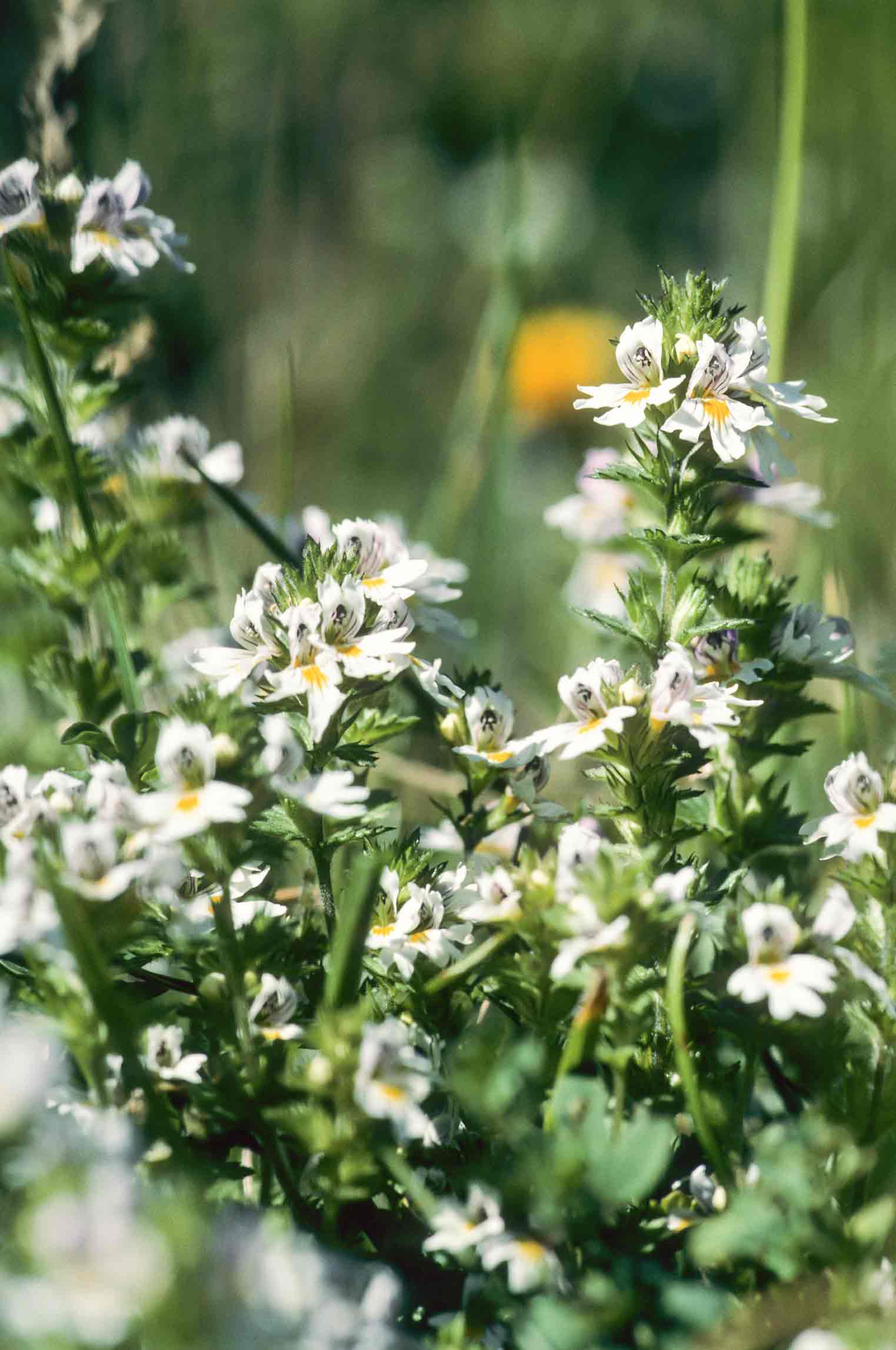 “L’euphraise(Euphrasia officinalis) est très répandue dans les prairies des étages montagnard et alpin. Les belles fleurs de cette petite plante sont remarquables. L’euphraise est l’une des plantes régulièrement citées dans la littérature comme exemple de la théorie – triviale selon nous – des signatures, c’est-à-dire l’idée qu’une plante indique son action sur un organe par une ressemblance frappante avec cet organe. L’euphraise pourrait effectivement être un tel exemple, mais un argument bien plus fort en faveur de son effet connu sur les yeux est le fait qu’il s’agit d’un hémiparasite.