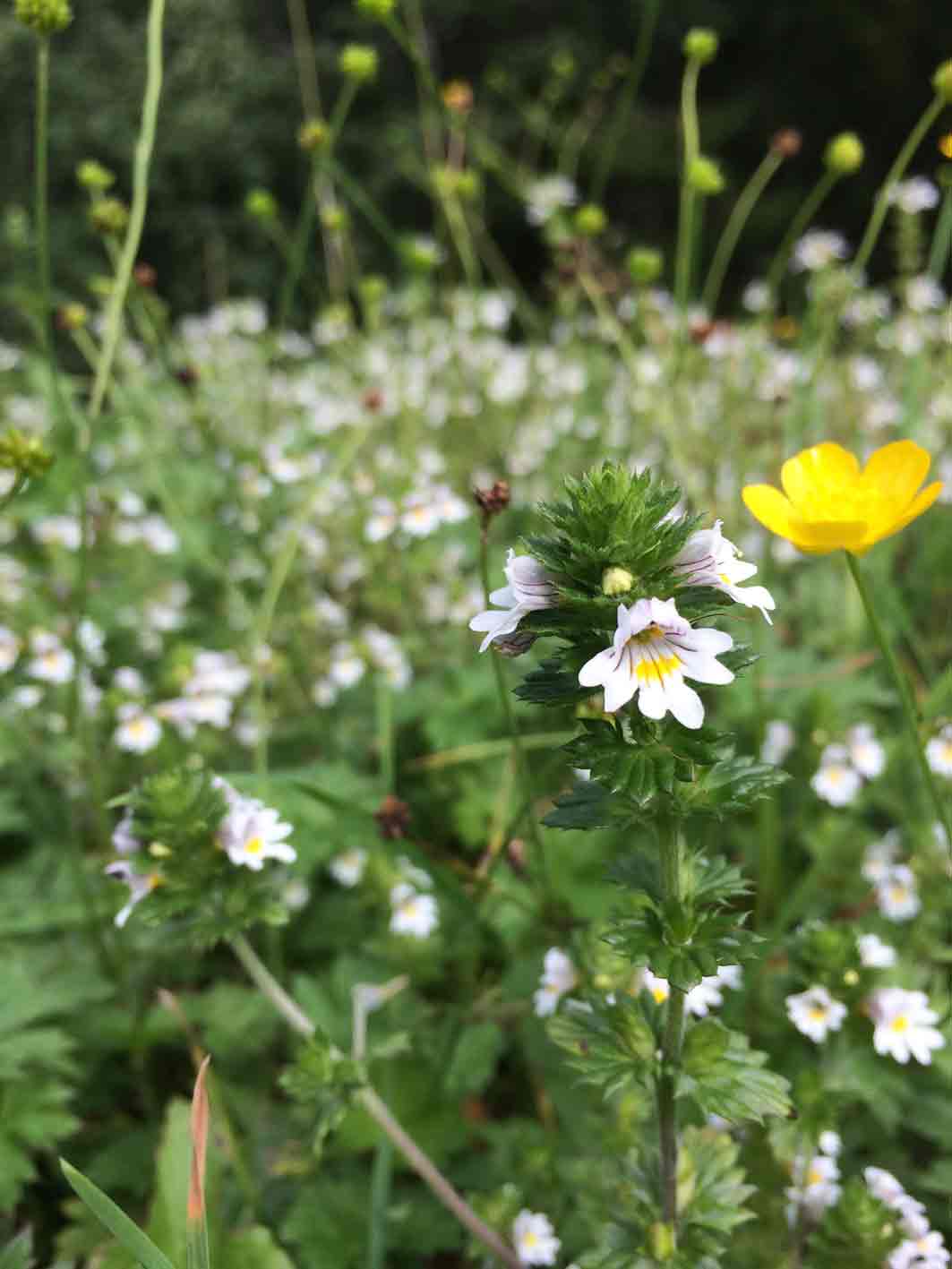 Les deux espèces d’euphraise, Euphrasia stricta et Euphrasia rostkoviana , appartiennent à la famille des orobanches (Orobrancheae). Les deux espèces se rencontrent dans les prairies et les pâturages, volontiers en altitude. Leurs sites sont plutôt pauvres en nutriments et maigres. Si les prairies et les pâturages sont fertilisés, l’euphorbe disparaît rapidement. Les deux espèces mesurent entre 5 et 30 cm de haut, Euphrasia stricta pouvant être un peu plus grande. Bien que les plantes restent plutôt petites, elles sont bien visibles et perceptibles. Leurs tiges sont droites et ramifiées avec des branches longues et droites. Euphrasia stricta est recouverte de poils courts mais généralement sans poils glandulaires, tandis qu’Euphrasia rostkoviana est couverte de poils glandulaires. Les feuilles sont ovales. Les deux espèces fleurissent en été et en automne. Ce qui est intéressant chez Euphrasia, c’est que la phase de floraison et la phase de croissance végétative ne s’inhibent pas mutuellement, comme c’est le cas pour la plupart des plantes : Euphrasia continue de fleurir tout en poussant. Les fleurs qui en résultent sont relativement grandes, blanches et présentent une coloration supplémentaire sur la lèvre supérieure (violette) et la lèvre inférieure (jaune). Les deux espèces sont des “semi-parasites” qui ont besoin d’une connexion aux racines des plantes de prairie. Les plantes d’euphraise prélèvent ensuite l’eau et les nutriments des plantes de prairie à l’aide de racines absorbantes, ce qui leur permet de façonner elles-mêmes leur environnement : Les plantes “aspirées” poussent moins fort grâce à ce “vol”, elles restent donc plus petites, et l’euphorbe assure ainsi sa propre visibilité.