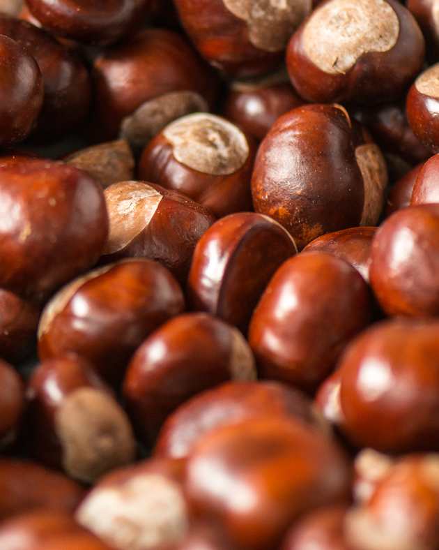 Les feuilles sont palmées et composées de 5 à 7 folioles. Toutes les parties proviennent d’un point central situé à l’extrémité du pétiole. C’est à partir de ce point que toute la forme de la feuille est maintenue, nourrie et contrôlée. Il s’agit d’une structure foliaire rare ; la plupart du temps, les folioles se ramifient latéralement à partir d’un axe qui passe par le centre de la composition foliaire. Une fois que les feuilles se sont étendues dans la plaine, la formation des fleurs est déjà avancée. Telles des bougies lumineuses, les inflorescences blanches ornent printemps après printemps les cimes des châtaigniers. De près, nous essayons de comprendre la structure de la fleur et la manière dont les pétales et les étamines s’assemblent. Une tâche difficile ! Seul un effort de réflexion permet de saisir l’ordre de la fleur de marronnier. Mais oublions la botanique et laissons-nous aller au rayonnement de cette fleur. Ses corolles d’un blanc éclatant, avec des touches de rouge et de jaune vif dans la gorge, sont tout simplement magnifiques à regarder. Plus tard, en été, le marronnier d’Inde a formé avec son feuillage dense une couronne d’arbre entièrement fermée qui empêche les rayons du soleil d’atteindre le sol ; une ombre parfaite. C’est pourquoi cet arbre est si populaire dans les restaurants de jardin. En automne, les enfants se réjouissent de ses graines brunes et pleines, les châtaignes. Entourées d’une coque verte charnue et épineuse, les graines mûrissent. L’enveloppe du fruit se fend ensuite et laisse tomber les graines sur le sol. L’éclat des châtaignes fraîchement “écloses” s’estompe après peu de temps ; il ne semble pas destiné au monde extérieur, il agit à l’intérieur du fruit. En résumé, nous reconnaissons dans le marron d’Inde des forces de redressement et de contrôle central, ainsi que l’imprégnation de l’intérieur assombri par un blanc lumineux, des couleurs vives et un éclat spéculaire”.