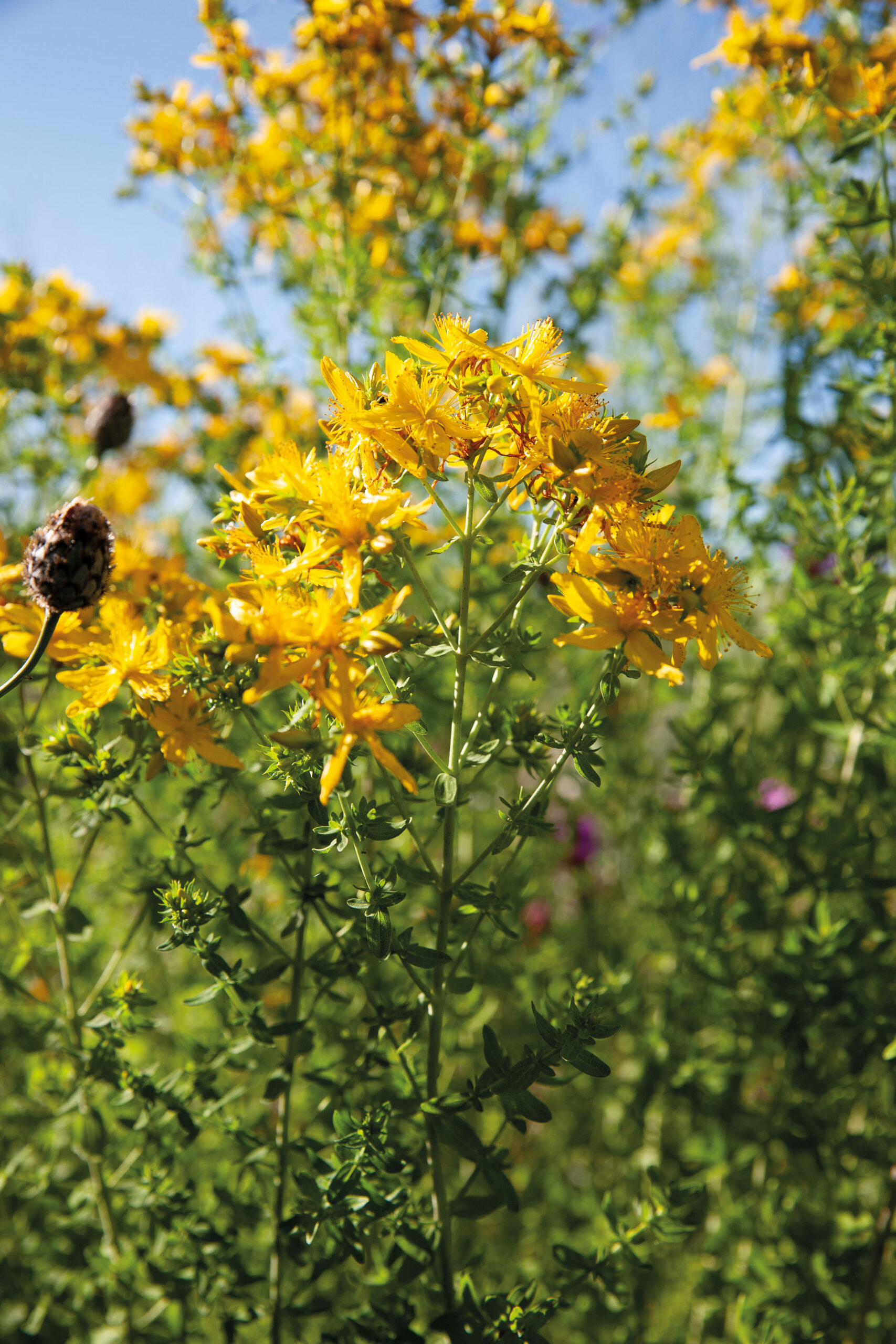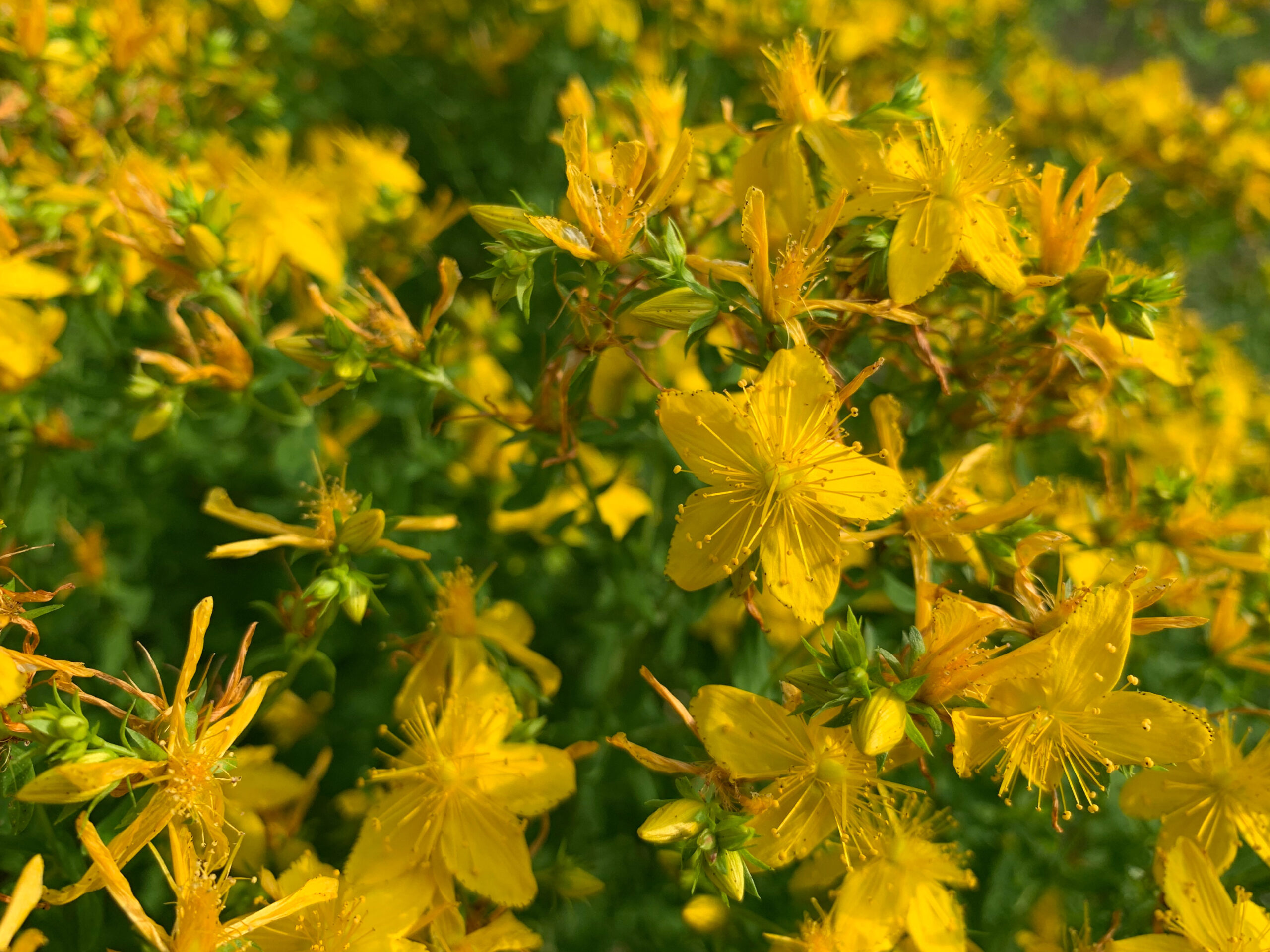 Hypericum perforatum L., le millepertuis, est une plante vivace à feuilles caduques, répandue dans toute l’Europe et que l’on trouve dans des endroits plutôt secs et ensoleillés. L’espèce appartient à la famille des Hypericacées, peut atteindre une hauteur de 80 cm environ et pousse verticalement à partir de sa racine fusiforme. La tige ligneuse très dure du millepertuis est entièrement bifide, ce que l’on peut très bien sentir en glissant les doigts le long de la tige. Dans la partie supérieure, la tige se ramifie de manière ramifiée et les pousses latérales poussent en oblique vers le haut, formant ainsi un triangle au sommet avec la tige au centre. Sur les tiges et les pousses latérales se trouvent les feuilles opposées de la plante, de forme ovale à linéaire allongée. Elles sont densément couvertes de glandes huileuses claires et transparentes qui donnent aux feuilles un aspect “perforé”. C’est ce qui a valu à l’espèce son surnom de “perforatum”. Dans la partie supérieure de la plante, les fleurs se forment en juin, généralement autour de la Saint-Jean. Celles-ci sont pentamétriques, fleurissent en jaune et sont réunies en cymes. Si l’on observe les pétales jaunes de plus près, on peut y voir des taches sombres de glandes. En outre, les pétales ont un côté plat et un côté bombé. Cela les rend légèrement asymétriques et donne à la fleur dans son ensemble la forme d’un moulin à vent. Autour du centre de la fleur, de nombreuses étamines sont regroupées en faisceaux qui s’étendent vers l’extérieur comme des rayons, donnant ainsi à la fleur un aspect solaire. Après la fécondation, l’ovaire, situé tout au centre, donne naissance à une capsule qui contient de nombreuses petites graines. Lorsqu’on frotte la fleur entre les doigts, l’hypéricine qu’elle contient laisse une coloration rouge sang.