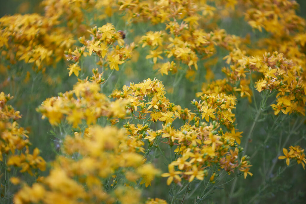 Hypericum perforatum L., le millepertuis, est une plante vivace à feuilles caduques, répandue dans toute l’Europe et que l’on trouve dans des endroits plutôt secs et ensoleillés. L’espèce appartient à la famille des Hypericacées, peut atteindre une hauteur de 80 cm environ et pousse verticalement à partir de sa racine fusiforme. La tige ligneuse très dure du millepertuis est entièrement bifide, ce que l’on peut très bien sentir en glissant les doigts le long de la tige. Dans la partie supérieure, la tige se ramifie de manière ramifiée et les pousses latérales poussent en oblique vers le haut, formant ainsi un triangle au sommet avec la tige au centre. Sur les tiges et les pousses latérales se trouvent les feuilles opposées de la plante, de forme ovale à linéaire allongée. Elles sont densément couvertes de glandes huileuses claires et transparentes qui donnent aux feuilles un aspect “perforé”. C’est ce qui a valu à l’espèce son surnom de “perforatum”. Dans la partie supérieure de la plante, les fleurs se forment en juin, généralement autour de la Saint-Jean. Celles-ci sont pentamétriques, fleurissent en jaune et sont réunies en cymes. Si l’on observe les pétales jaunes de plus près, on peut y voir des taches sombres de glandes. En outre, les pétales ont un côté plat et un côté bombé. Cela les rend légèrement asymétriques et donne à la fleur dans son ensemble la forme d’un moulin à vent. Autour du centre de la fleur, de nombreuses étamines sont regroupées en faisceaux qui s’étendent vers l’extérieur comme des rayons, donnant ainsi à la fleur un aspect solaire. Après la fécondation, l’ovaire, situé tout au centre, donne naissance à une capsule qui contient de nombreuses petites graines. Lorsqu’on froisse la fleur entre les doigts, l’hypéricine qu’elle contient laisse une couleur rouge sang.