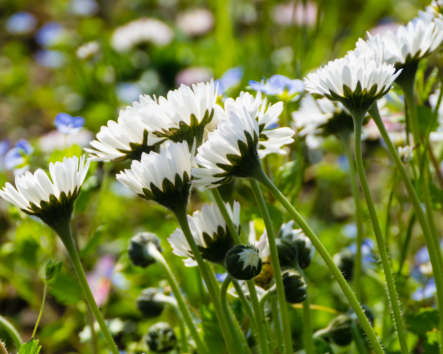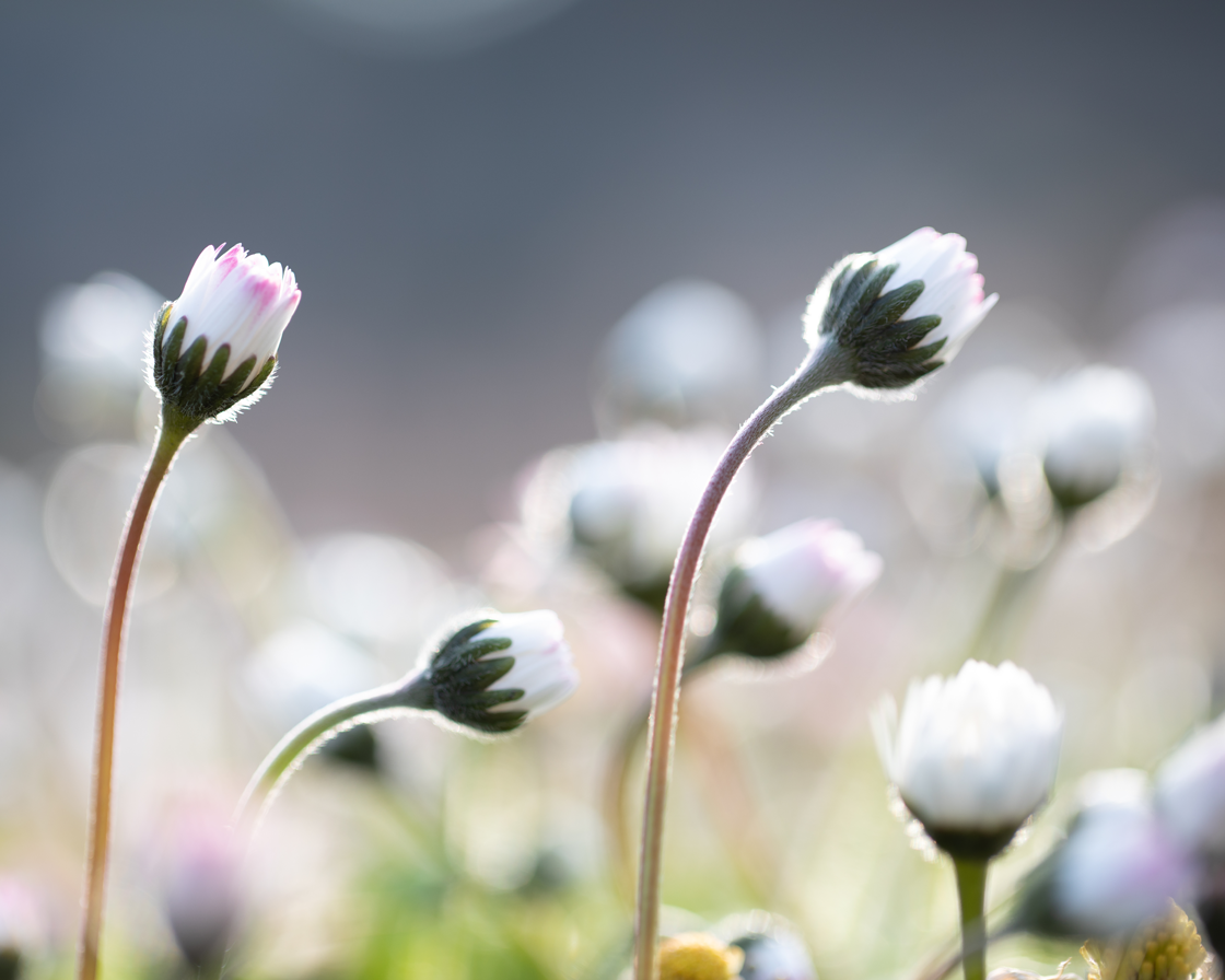 “Qui n’a pas cueilli des marguerites dans son enfance pour en faire un bouquet pour sa mère ? N’est-ce pas une note pure et claire qui résonne dans nos cœurs lorsque nous observons de jeunes enfants cueillir des marguerites et en décorer leurs cheveux ? Les enfants ressentent une proximité intérieure avec cette petite fleur modeste qui est souvent ignorée et piétinée, mais qui conserve son intégrité. La pâquerette est une fleur de pelouse et de prairie. Elle fait partie de la famille des composées, riche en espèces. On peut sans doute qualifier la structure simple et claire du capitule de prototype de fleur enfantine. Les fleurs ligulées, roses à l’éclosion, deviennent ensuite d’un blanc pur, et le disque floral est un simple cercle jaune. Si la pelouse est tondue pour la première fois au printemps et que les capitules sont coupés, la plante ne tarde pas à produire de nouvelles fleurs, mais avec des tiges plus courtes. Si la pelouse est tondue encore plus court, cette petite plante s’adapte immédiatement. Elle semble indestructible, elle ne connaît qu’une seule chose : dresser sa tête de fleur vers le haut et la garder pure. D’où vient cette force, ce courage que rien ne peut entamer ? La plante possède une rosette de feuilles inhabituellement résistante, à partir de laquelle elle mobilise sans cesse de nouvelles forces.