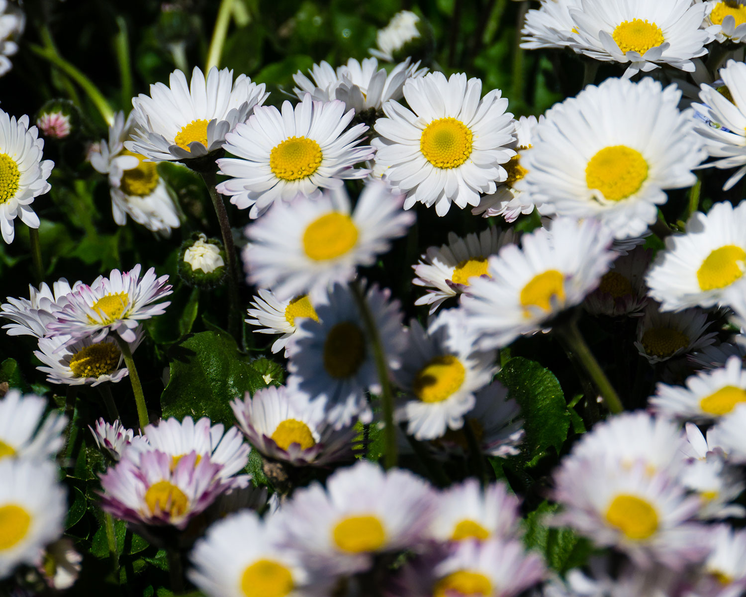 La pâquerette(Bellis perennis L.), appartient à la famille des astéracées (Asteraceae). C’est une plante vivace qui peut atteindre 5 à 15 cm de hauteur et dont la rosette de feuilles basales vitales reste visible toute l’année. Des feuilles légèrement charnues et obovales naissent des tiges florales sans feuilles au bout desquelles se trouvent des fleurs de 10 à 30 mm. L’intérieur des fleurs est composé de fleurs tubulaires jaunes, tandis que les fleurs ligulées blanches, qui peuvent souvent être roses, se trouvent sur les bords. La plante fleurit presque toute l’année (de janvier à novembre), mais la période de floraison principale se situe clairement au printemps. Si les fleurs sont fauchées ou broutées, la rosette pleine de vitalité donne immédiatement naissance à de nouvelles fleurs. Une gestion fréquente favorise même la plante, c’est pourquoi elle se reproduit volontiers dans les pelouses tondues à ras.