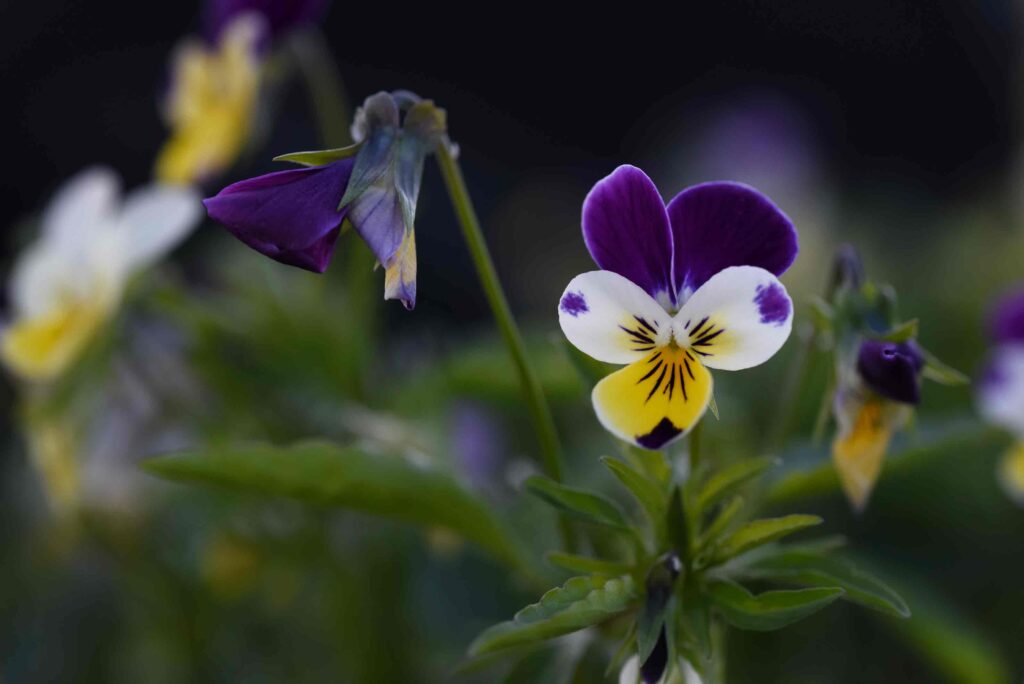 La pensée sauvage, Viola tricolor L., est une plante annuelle ou vivace qui peut atteindre une hauteur de 10 à 40 cm. Ses tiges sont ascendantes et couvertes de feuilles pétiolées et découpées en forme de cœur ou d’œuf allongé. Les limbes mesurent de 1 à 3 cm de long et comportent chacun deux stipules, généralement lancéolées. A partir d’avril environ et jusqu’en septembre, la plante fleurit avec de belles et remarquables fleurs colorées et décorées. Elles sont isolées à l’aisselle des feuilles et peuvent mesurer jusqu’à 3 cm de long. Les 5 pétales sont nettement plus longs que les sépales, qui sont ornés d’appendices. Les deux pétales supérieurs sont généralement entièrement bleus ou bleu-violet. Les trois pétales inférieurs peuvent être jaunes ou blanchâtres, ou seulement jaunes vers la gorge, l’entrée de la fleur. Dans l’ensemble, les pétales sont de couleur très variable et sont parfois décorés de traits de miel d’un pourpre intense. Le nom “tricolor”, c’est-à-dire tricolore, fait déjà référence à cette coloration de la fleur. Le pétale le plus bas est toujours éperonné. Si l’on observe les pétales de plus près, on remarque immédiatement, outre la couleur, la surface veloutée et douce. Les fleurs elles-mêmes ont un parfum subtil, mais la plante entière dégage une forte odeur médicinale lorsqu’on la presse ou qu’on la coupe.