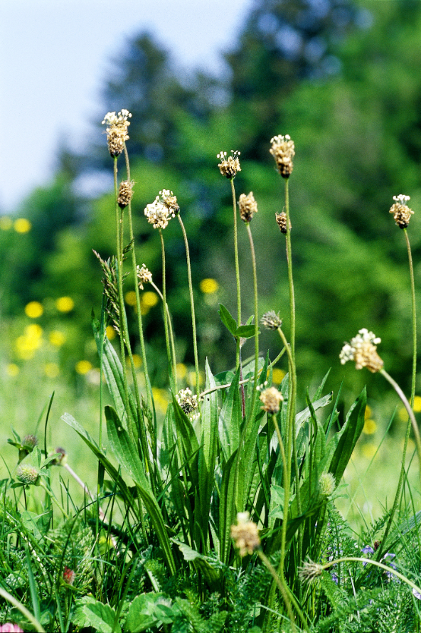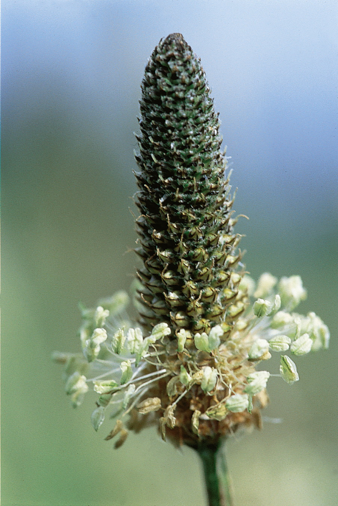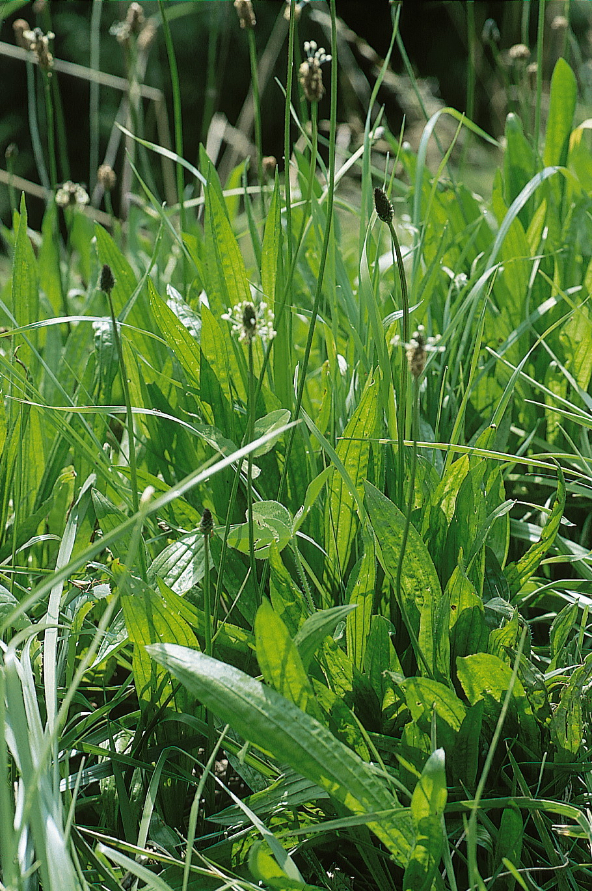 Plantago lanceoalata L., le plantain lancéolé est une plante que l’on trouve dans le monde entier. De sa racine pivotante, elle produit des feuilles lancéolées, peu différenciées, aux nervures parallèles. Cette nervosité parallèle constitue une particularité. La plupart des dicotylédones, dont fait partie le plantain lancéolé, ont des feuilles réticulées. Les feuilles, qui peuvent atteindre 30 cm de long, sont regroupées en une rosette basale. De cette rosette naît la tige anguleuse de l’épi, qui peut atteindre 50 cm de haut et qui élève l’inflorescence bien au-dessus de la zone foliaire. L’épi floral situé à son extrémité fleurit continuellement de bas en haut. Les fleurs insignifiantes réunies en épi ne se distinguent que par leurs étamines blanchâtres qui dépassent largement des fleurs à maturité. Elles n’ont pas l’éclat que l’on pourrait attendre d’une fleur végétale. Les graines, qui se forment plus tard, sont très mucilagineuses, mais les feuilles le sont également. Les feuilles de la plante dégagent une odeur typique de champignon lorsqu’on les froisse.