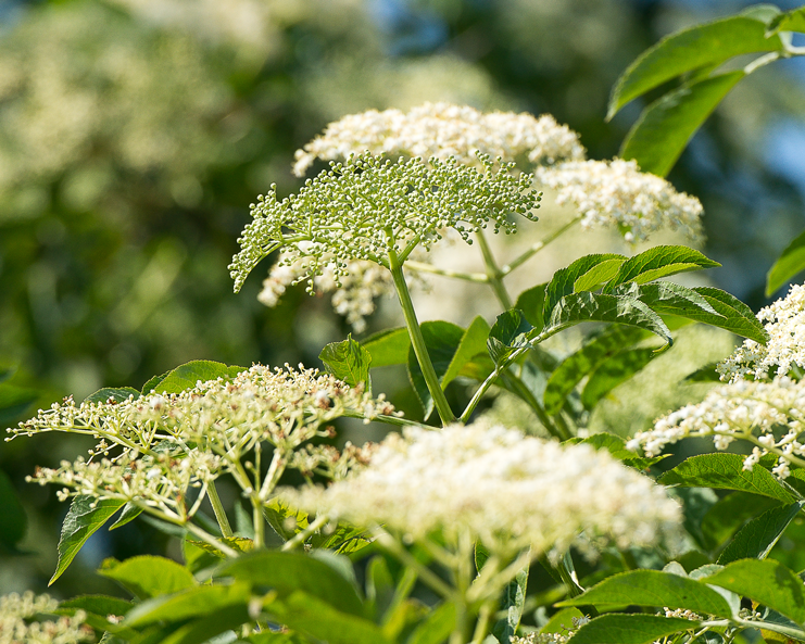 Les composants typiques du sureau, Sambucus nigra L., sont l’huile essentielle et les flavonoïdes. Parmi les autres composants, on trouve des stérols et des triterpènes, des acides phénoliques comme l’acide chlorogénique, des mucilages et des tanins. Les fruits, en particulier, contiennent également diverses vitamines. On peut trouver des traces de glycosides cyanogènes potentiellement toxiques, comme la sambunigrine, mais ils se décomposent à la cuisson.