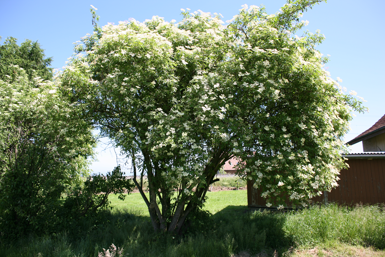 Un an plus tard, le jeune bois s’est consolidé extérieurement, l’écorce s’est formée et les branches commencent maintenant à se courber légèrement vers le sol. Si nous observons l’intérieur des branches en enlevant une couche après l’autre du bois à l’aide d’un couteau, nous découvrons une moelle spongieuse, poreuse et légère. La comparaison avec le polystyrène expansé s’impose. La moelle de la branche de sureau est donc richement imprégnée d’air. Ne s’agit-il pas là d’une relation étrange ? Dans la moelle, nous trouvons des poches d’air, tandis que l’odeur des feuilles et des jeunes pousses rappelle un processus de combustion avec un apport d’air insuffisant. Au fur et à mesure de leur croissance, les branches se courbent de plus en plus vers le bas. Chez les arbustes plus âgés, les branches prennent parfois la forme d’arches bien marquées. Au sommet de ces portes, des branches de plus en plus jeunes s’élèvent et forment plus tard également des arcs, de sorte que plusieurs branches courbées se superposent souvent. Nous trouvons ainsi dans le sureau l’expression d’une force vitale verte et ascendante, qui est saisie par la pesanteur terrestre, se reforme, s’étire vers le haut, puis est à nouveau attirée vers le bas. L’écorce d’un vieux sureau mûr a un aspect usé et vieillissant. On ne peut imaginer de plus grand contraste entre la peau verte des jeunes branches et l’écorce grise déchiquetée du vieux tronc. Mais le sureau n’est pas malade, de nouvelles pousses poussent comme toujours, il a juste l’air très vieux. Au printemps, le sureau produit une abondante floraison. Les ombelles blanches (ce sont des trompettes) sont souvent légèrement concaves, comme des miroirs paraboliques réceptifs dirigés vers le haut, ce qui est tout à fait inhabituel pour des ombelles. Les petites fleurs individuelles ressemblent à des étoiles blanches clignotantes qui entourent des anthères jaunes et dorées débordantes. Peu d’autres plantes produisent une telle quantité de pollen. Si l’on sèche par exemple des fleurs de sureau sur un tissu ou un papier blanc, celui-ci est recouvert d’une couche de poudre de pollen jaune qui rappelle la poudre de soufre ardente.